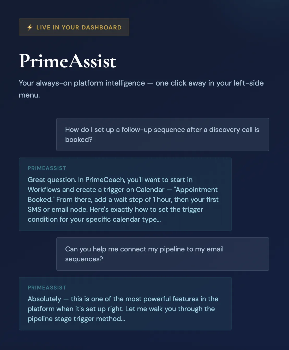 When you have a platform question, a workflow you're trying to figure out, or an onboarding step that isn't clicking - PrimeAssist is the answer that's always on and always specific to how PrimeCoach is built.